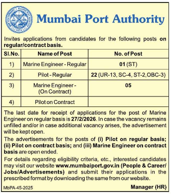 Mumbai Port Authority has announced Pilot Recruitment 2026 for filling 22 Pilot vacancies on a regular basis along with additional contract-based Pilot posts. These positions are crucial for safe navigation and pilotage of vessels at Mumbai Port. The recruitment is open to experienced marine professionals holding a Certificate of Competency as Master (Foreign Going) with the prescribed sea service and pilotage experience. Regular Pilot vacancies are category-wise distributed, while contract Pilot posts remain open-ended. Applications for these posts are required to be submitted offline in the prescribed format through the Mumbai Port Authority official website.