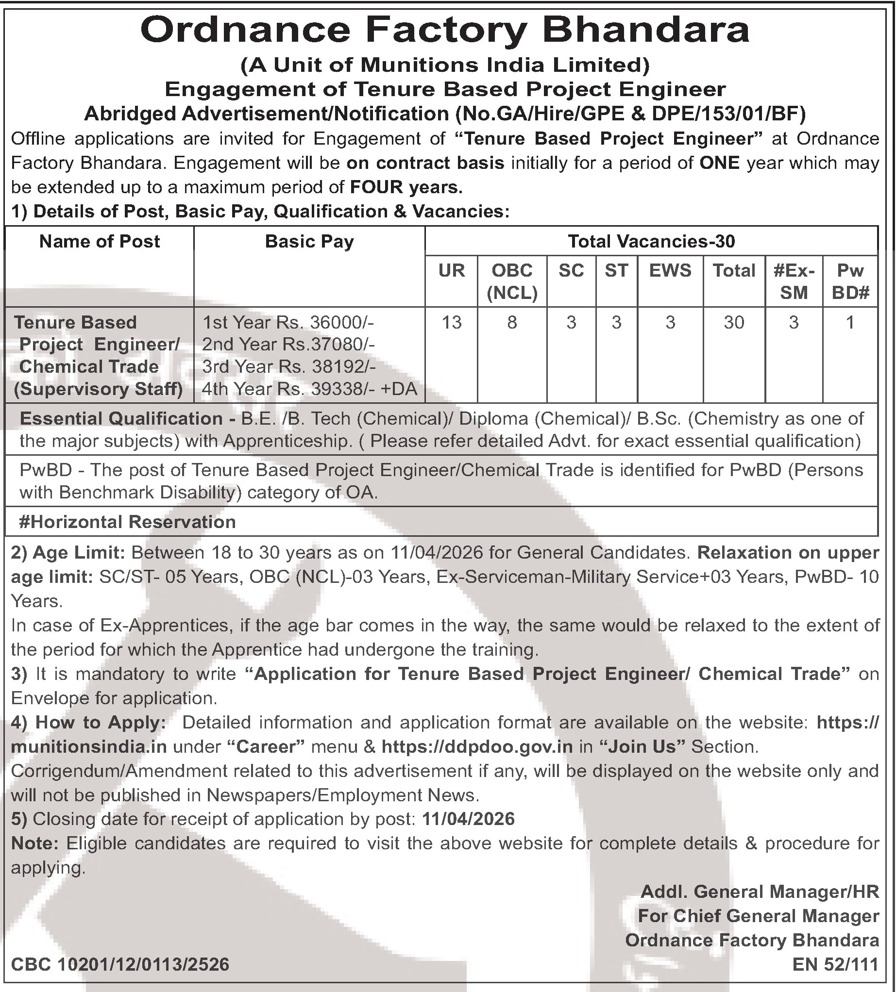 Ordnance Factory Bhandara, a unit of Munitions India Limited under the Ministry of Defence, Government of India, has released a recruitment notification for 30 Tenure Based Project Engineer (Chemical Trade – Supervisory Staff) posts on a contractual basis. Candidates with qualifications such as B.E./B.Tech, Diploma in Chemical Engineering, or B.Sc. (Chemistry) along with apprenticeship training are eligible to apply. This recruitment offers a valuable opportunity for candidates seeking engineering roles in the defence manufacturing sector. The application process is offline, and candidates must submit their forms before the closing date.
